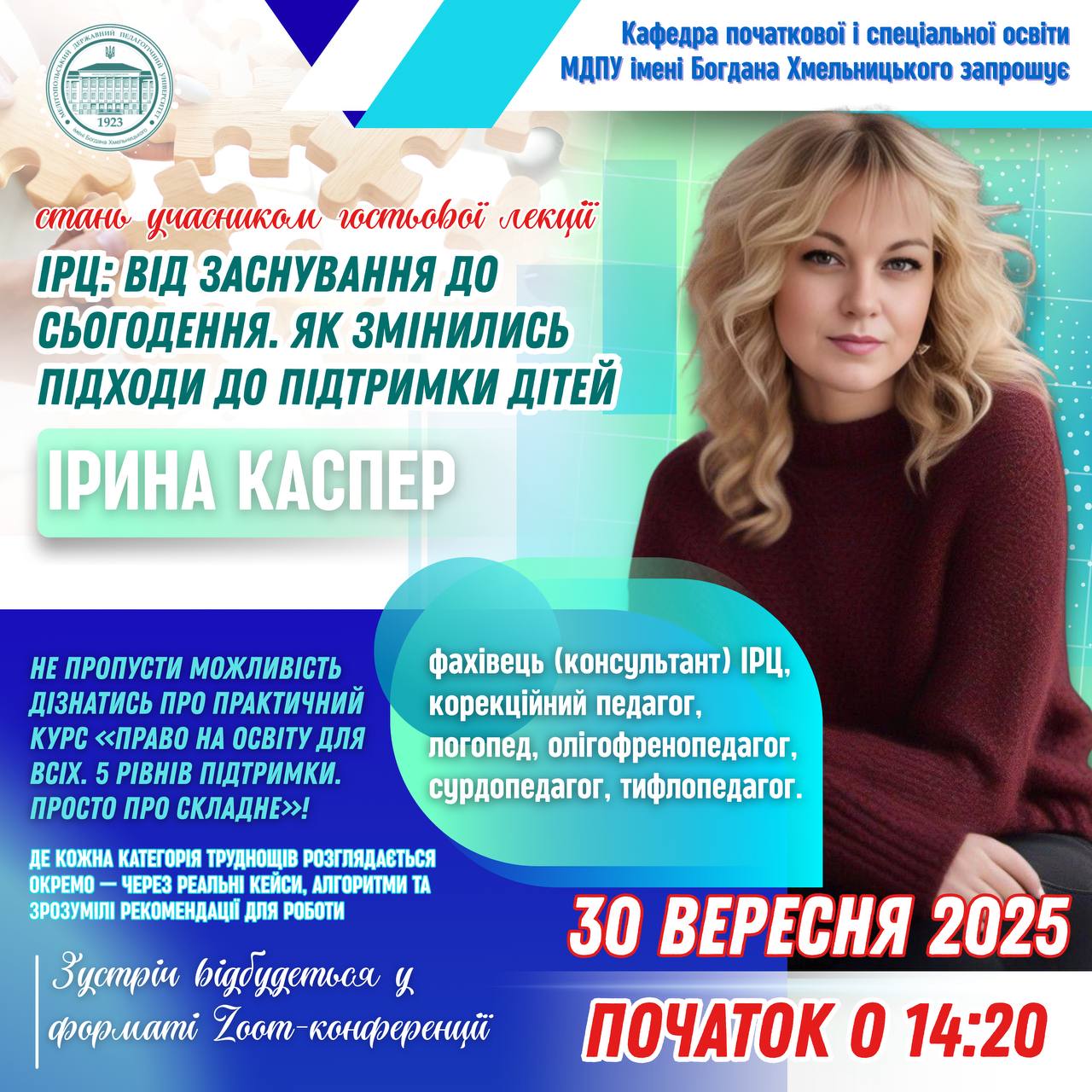 📚✨ Кафедра початкової і спеціальної освіти МДПУ імені Богдана Хмельницького запрошує на гостьову лекцію, присвячену еволюції підходів до підтримки дітей з освітніми труднощами. 🎤🙋🏻♀️ Спікер: Каспер Ірина — фахівець (консультант) ІРЦ, корекційний педагог, логопед, олігофренопедагог, сурдопедагог, тифлопедагог. 🧠📌 Про що говоритимемо:📒як змінювалося розуміння дитячих труднощів у різні роки;📒з якими викликами працювали фахівці;📒як трансформувалася взаємодія з…