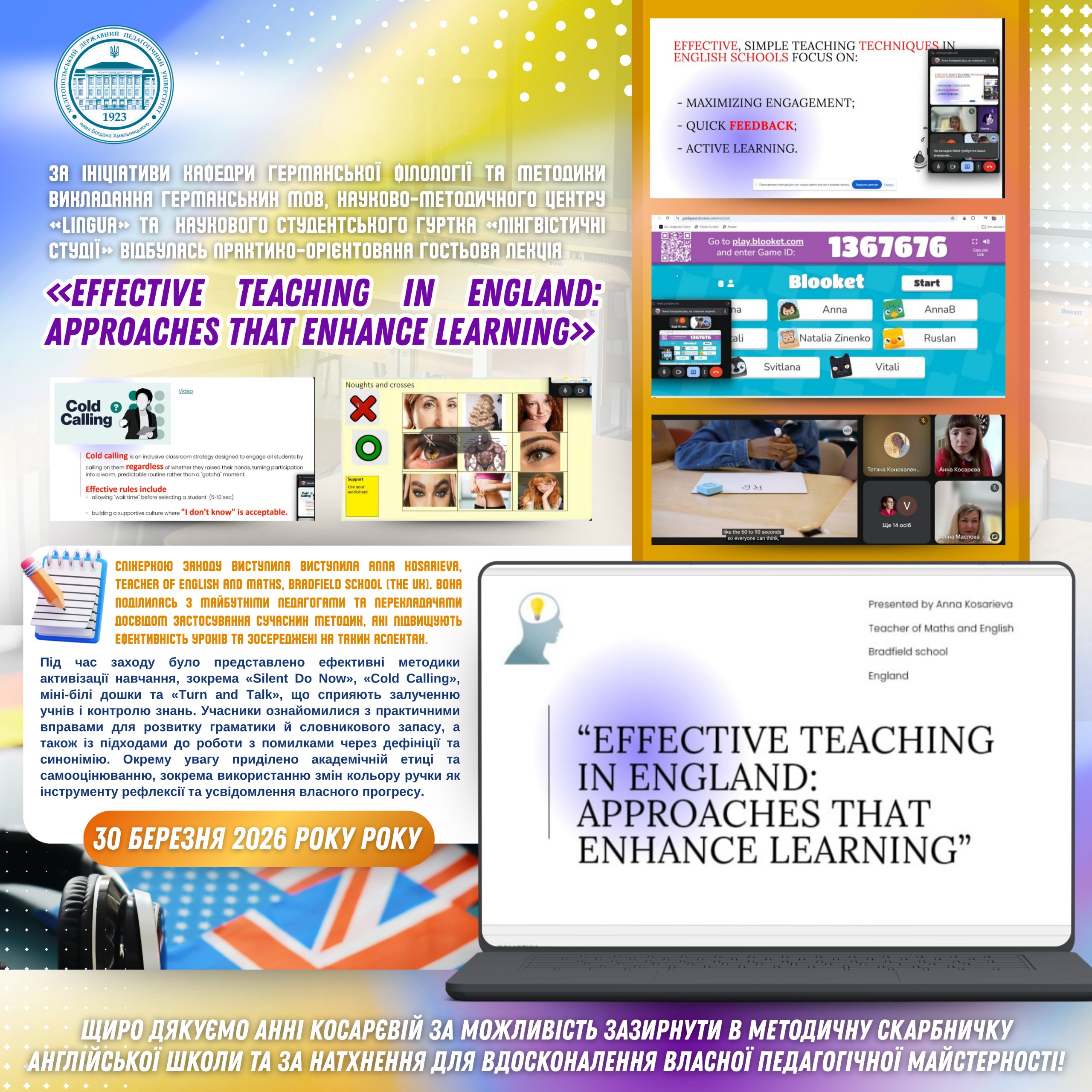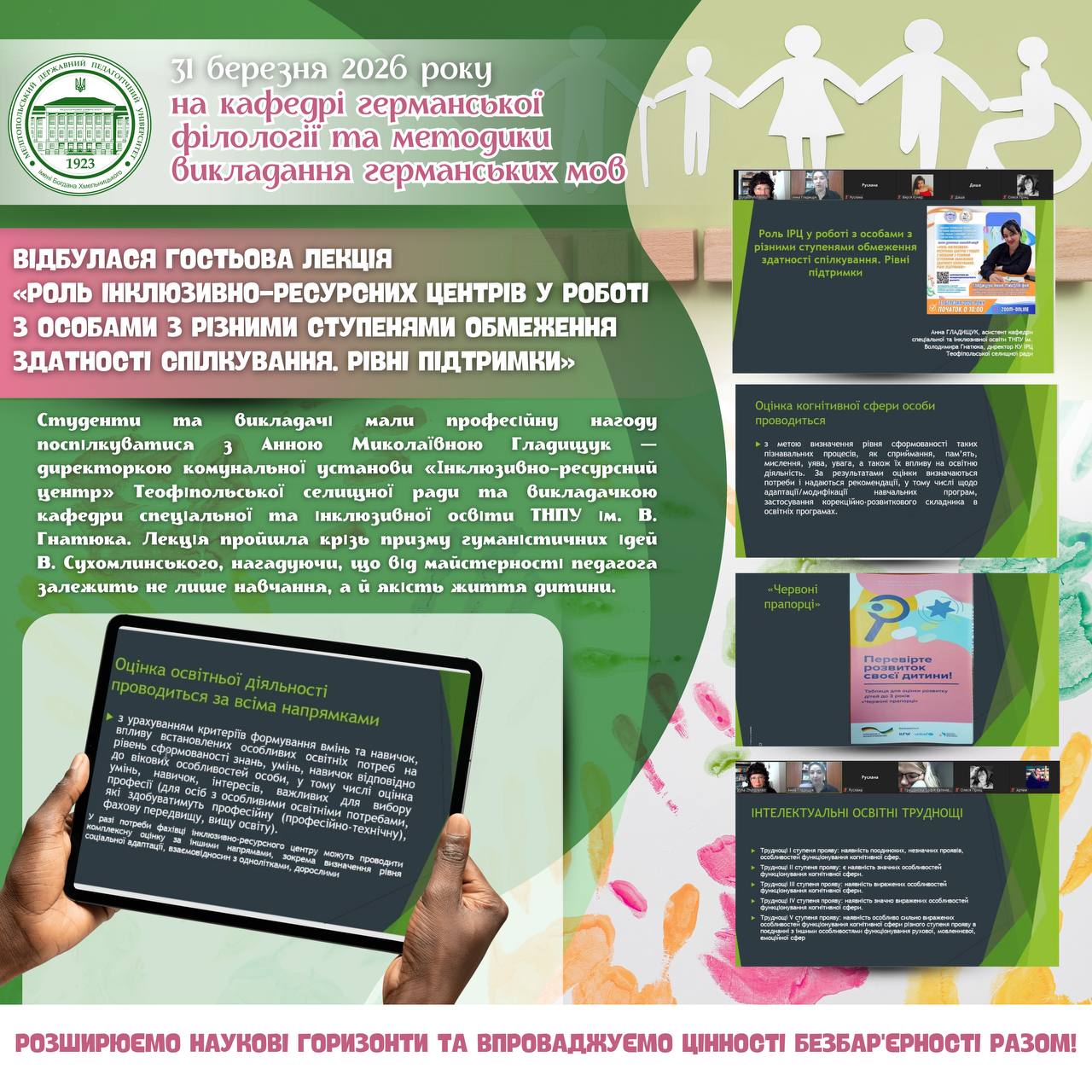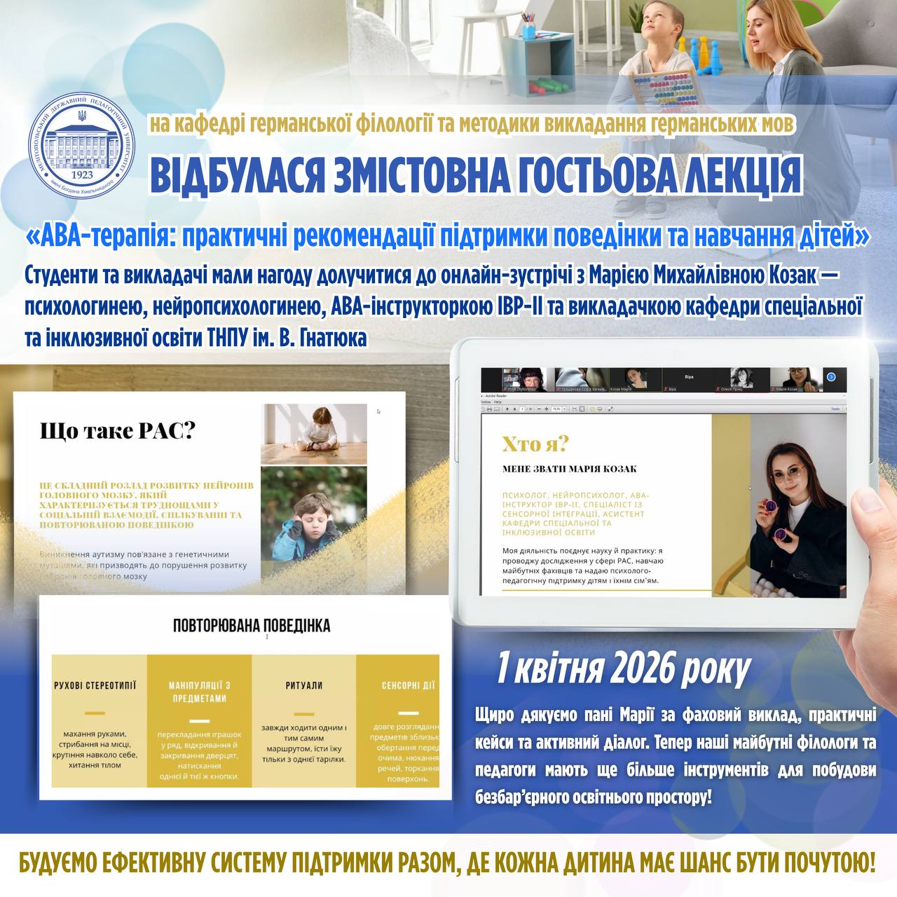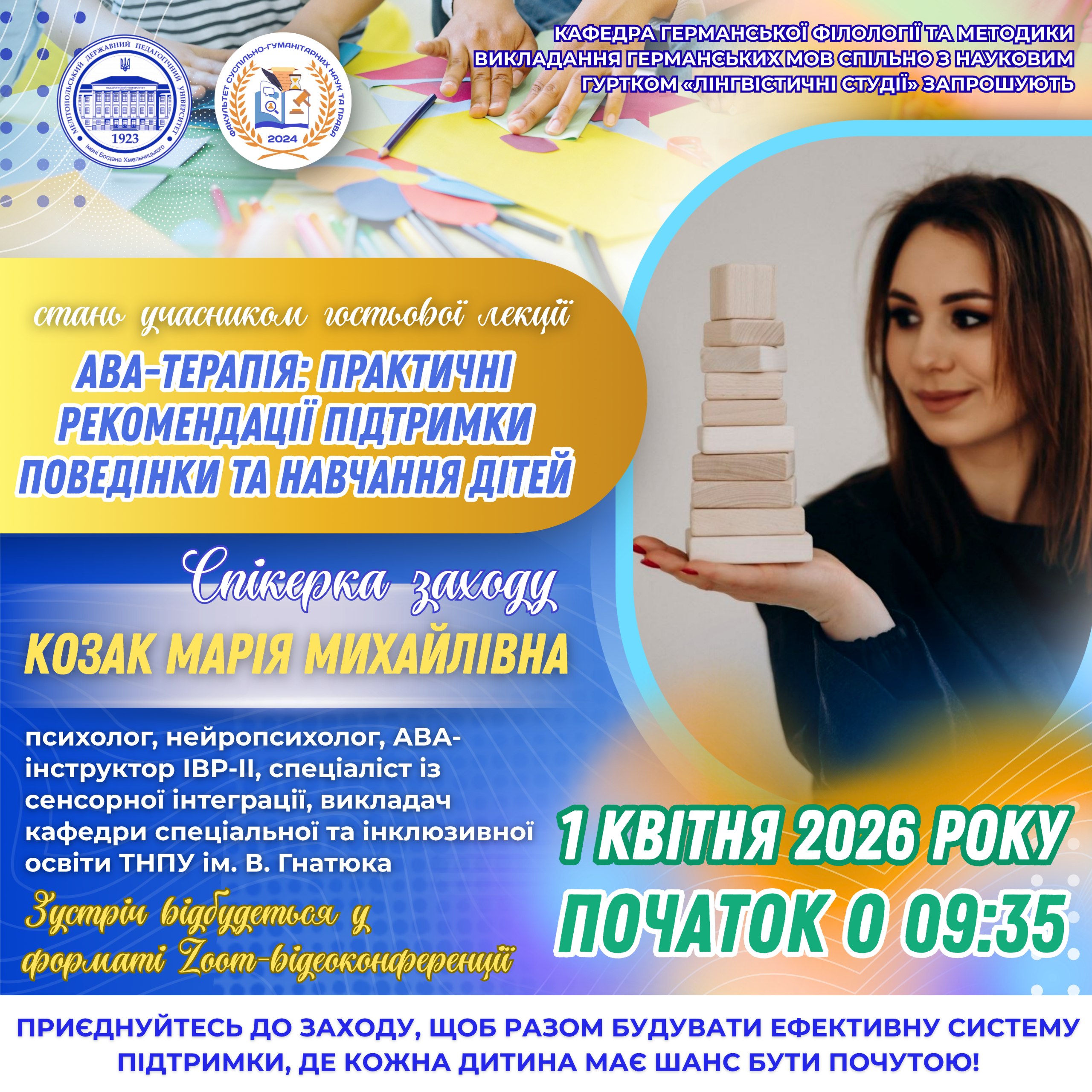 📅 У середу, 1 квітня, на кафедрі германської філології та методики викладання германських мов у межах роботи науково-методичного центру «Лінгва» та наукового гуртка «Лінгвістичні студії» відбулася змістовна гостьова лекція, присвячена одному з найефективніших методів корекційної роботи. 👩⚕️💬 Студенти та викладачі мали нагоду долучитися до онлайн-зустрічі з Марією Михайлівною Козак — психологинею, нейропсихологинею, АВА-інструкторкою ІВР-ІІ та…