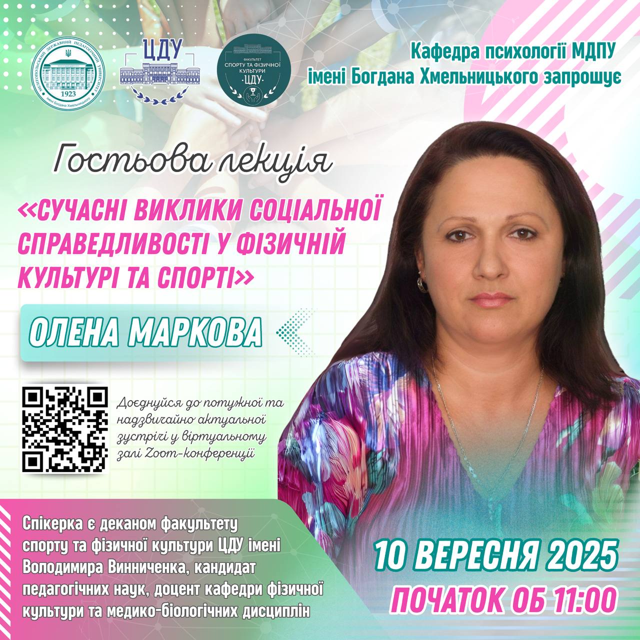 🏛️‼️Кафедра психології МДПУ імені Богдана Хмельницького має честь запросити всіх охочих на потужну та надзвичайно актуальну зустріч! 📌 Тема: «Сучасні виклики соціальної справедливості у фізичній культурі та спорті» 🗓 Дата: 10 вересня 2025 року🕚 Час: 11:00 – 12:00 🎤🙋🏻♀️Лектор: Олена Маркова – декан факультету спорту та фізичної культури Центральноукраїнського державного університету імені Володимира Винниченка, кандидат…