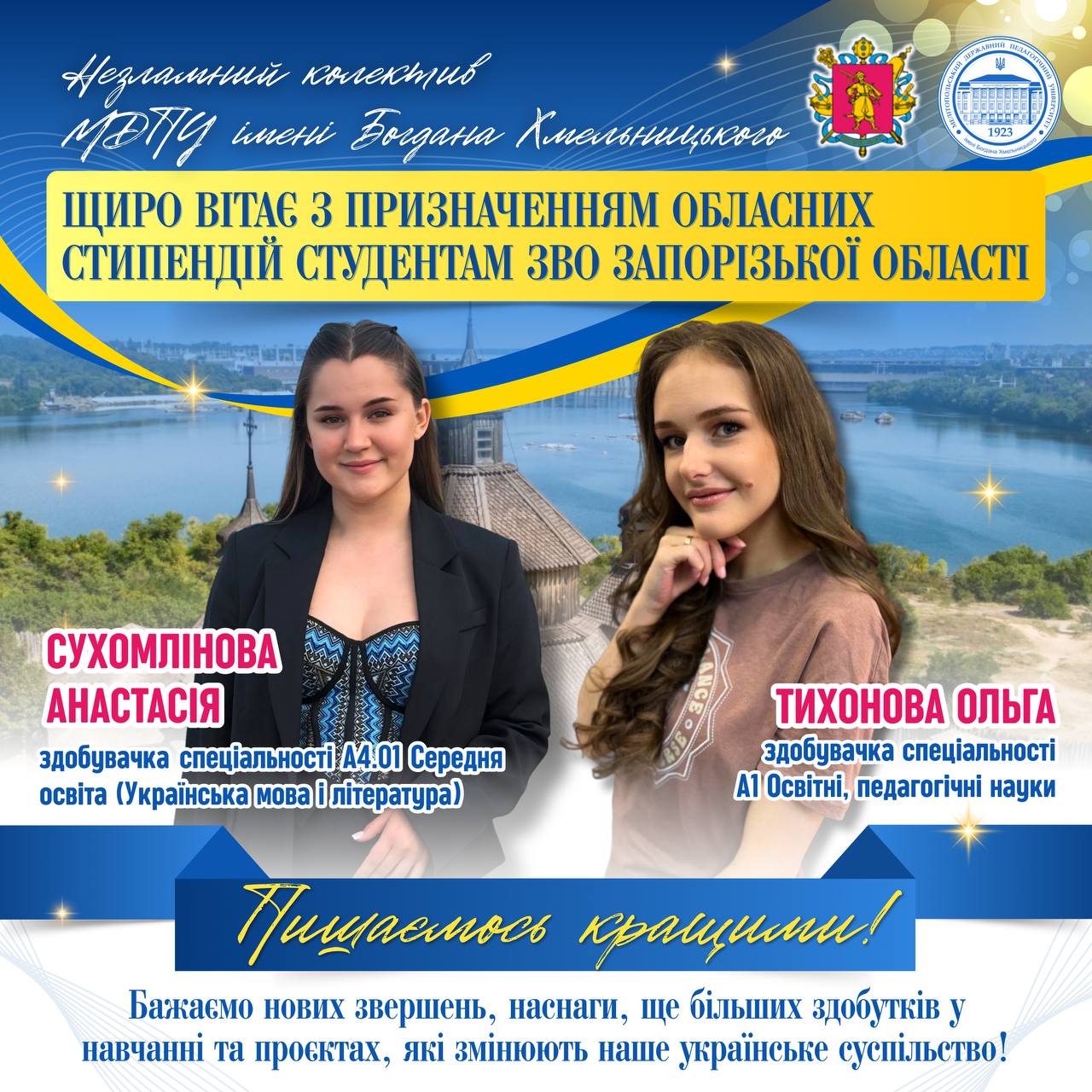 🎓🥳 Колектив науково-педагогічних працівників та студентська спільнота МДПУ імені Богдана Хмельницького щиро вітає наших талановитих студенток — лауреаток обласних стипендій: 👩🏼🎓💐ТИХОНОВУ ОЛЬГУ ЮРІЇВНУ — здобувачку вищої освіти М714-сп групи І року навчання за освітнім ступенем магістра, спеціальності А1 Освітні, педагогічні науки, факультету соціально-педагогічної та мистецької освіти; 👩🏼🎓💐СУХОМЛІНОВУ АНАСТАСІЮ СЕРГІЇВНУ — здобувачку вищої М214-сг групи ІІ…