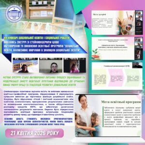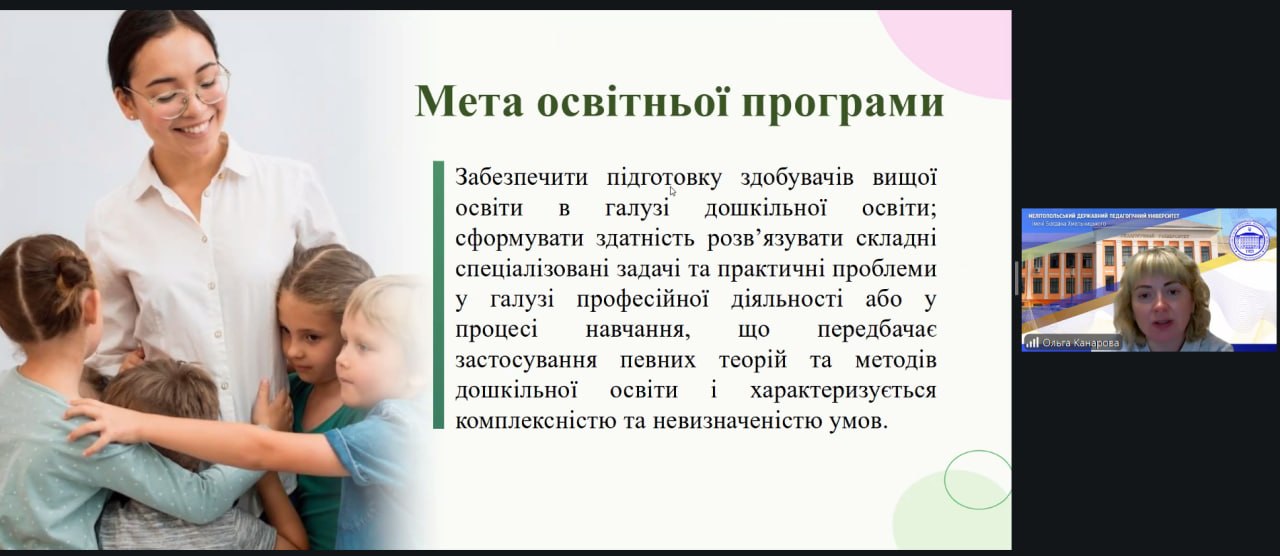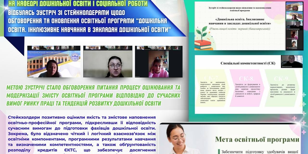 📅 21 квітня 2026 року на кафедрі дошкільної освіти і соціальної роботи Мелітопольського державного педагогічного університету імені Богдана Хмельницького відбулась зустріч зі стейкхолдерами щодо обговорення та оновлення освітньої програми «Дошкільна освіта. Інклюзивне навчання в закладах дошкільної освіти» підготовки здобувачів першого (бакалаврського) рівня вищої освіти (гарант — к.пед.н., доцент Канарова О.В., завідувач кафедри — к.пед.н., доцент Жейнова С.С.). Метою зустрічі стало обговорення процесу оцінювання та модернізації змісту освітньої програми відповідно до сучасних вимог ринку праці та тенденцій розвитку дошкільної освіти.