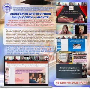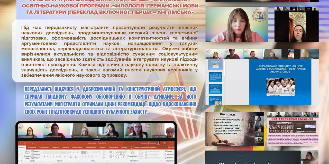 На кафедрі германської філології та методики викладання германських мов 15 квітня 2026 року успішно відбувся передзахист кваліфікаційних магістерських робіт здобувачів другого рівня вищої освіти — магістр спеціальності В11.041 «Філологія. Германські мови та літератури (переклад включно), перша – англійська» освітньо-наукової програми «Філологія. Германські мови та літератури (переклад включно), перша – англійська».