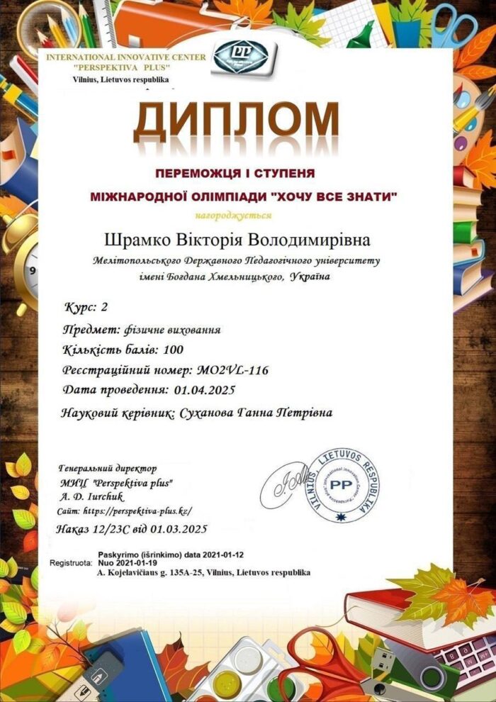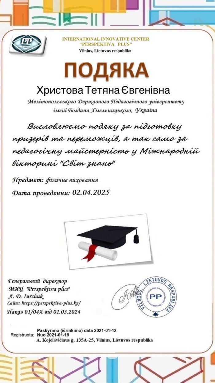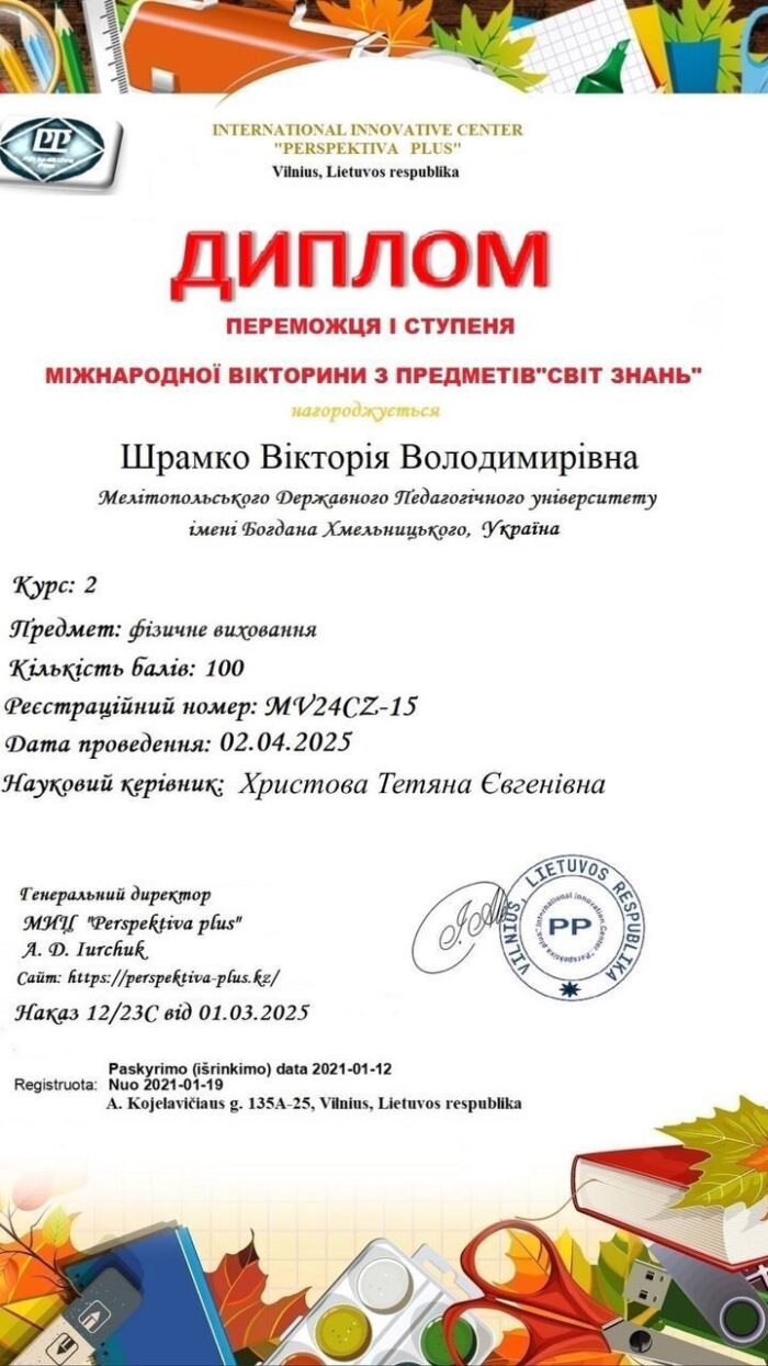 🏆🌸 І місце у Міжнародній вікторині «Світ знань» (номінація «Фізичне виховання»), науковий керівник – доктор біологічних наук, професор, завідувач кафедри теорії та методики фізичного виховання Христова Т.Є.