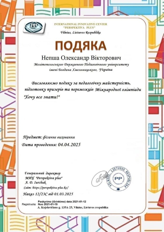🏆💐 І місце у Міжнародній олімпіаді «Хочу все знати» (предмет «Фізичне виховання»), керівник – старший викладач кафедри теорії та методики фізичного виховання Непша О.В.
