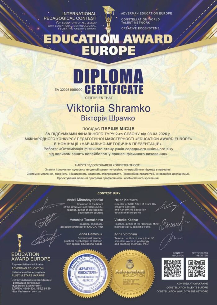 🇺🇦🎓 Шрамко Вікторію — здобувачку ступеня вищої освіти «бакалавр» спеціальності 014.11 «Середня освіта. Фізична культура» факультету фізичної культури, спорту та психології — з визначним досягненням — І МІСЦЕМ у міжнародному конкурсі педагогічної майстерності «Education Award Europe»! 🌍🥇