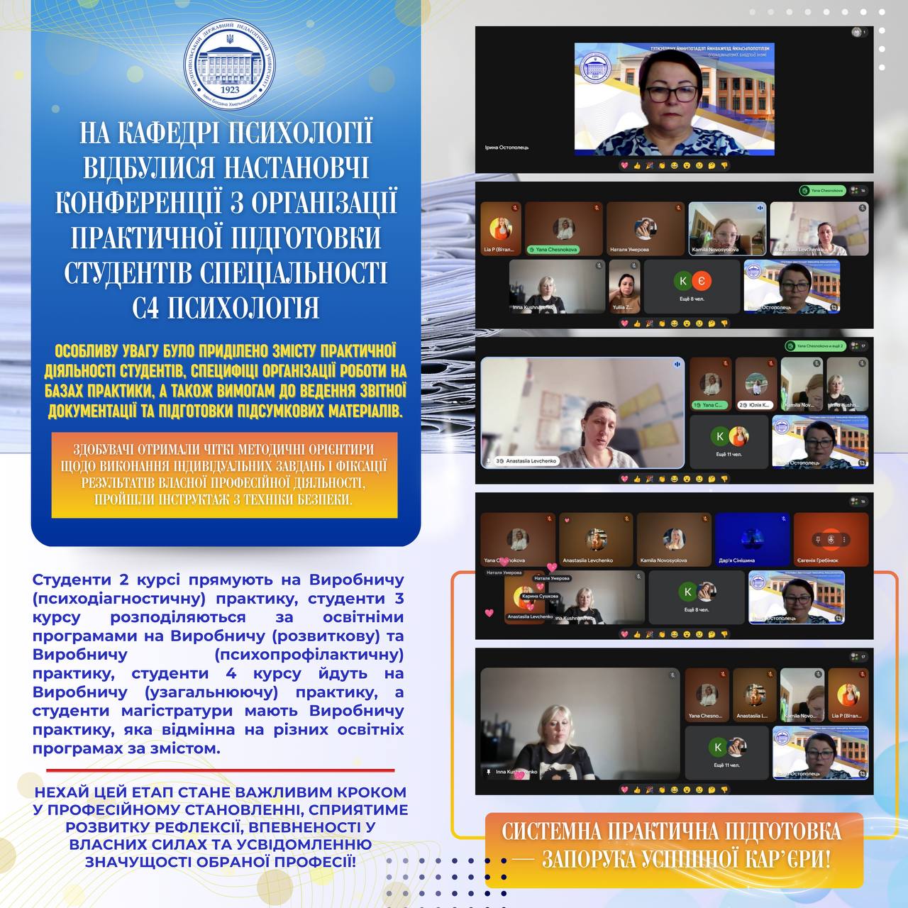 🇺🇦👩🏼‍🎓 На кафедрі психології відбулися настановчі конференції з організації практичної підготовки студентів спеціальності С4 Психологія.