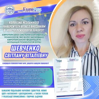 👩🏼‍🎓✨ Колектив Мелітопольського державного педагогічного університету імені Богдана Хмельницького щиро вітає Шевченко Світлану Віталіївну, кандидата психологічних наук, доцента кафедри психології, з внесенням до Європейського реєстру психологів EuroPsy та присудженням сертифіката EuroPsy — авторитетного європейського визнання професійної компетентності психолога.