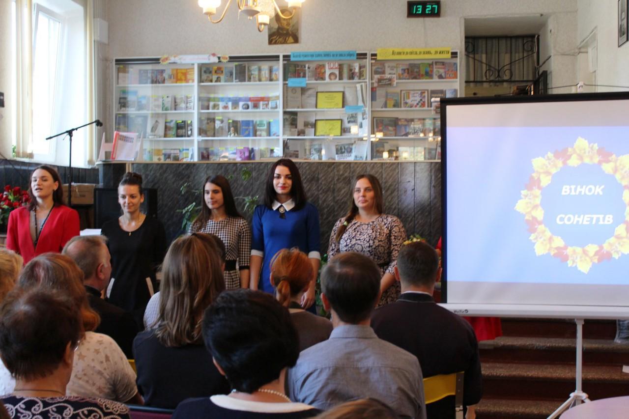 Студенти 215-ф групи – Стовбур В., Скориця Д., Чимиркова О.; 316-ф групи – Дуйловська І.; 217-ф групи – Говді Ю., Грушкіна Ю., Касьяненко І. прикрасили захід читанням вінку сонетів із нової книги митця, вплітаючи у метафоричний вінок квіти з поетичного саду Майстра. Твори О. Гончаренка характеризуються складною римою, ритмом, глибокими метафорами, символами й порівняннями, сповнені роздумів над гостроактуальними і вічними проблемами, що вимагають вдумливого читача і стають справжнім випробуванням для декламаторів. Але під керівництвом досвідченого педагога Зотової В.Г. студенти успішно виконали свою місію і запалили не лише серця присутніх, а й отримали щиру подяку і збірки від самого автора.