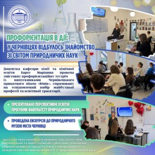 🏛 Важливою складовою профорієнтаційної роботи стала екскурсія до Природничого музею м. Чернівці, де учні мали змогу безпосередньо ознайомитися з унікальними експозиціями, що ілюструють різноманіття природних процесів і явищ. Такий формат сприяв інтеграції теоретичних знань із наочною демонстрацією, формуючи пізнавальний інтерес і наукову допитливість.