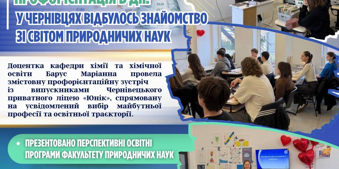 👩🏼🎓 Доцентка кафедри хімії та хімічної освіти Барус Маріанна провела змістовну профорієнтаційну зустріч із випускниками Чернівецького приватного ліцею «Юнік», спрямовану на усвідомлений вибір майбутньої професії та освітньої траєкторії.