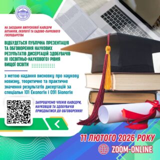 📅 11 лютого 2026 року на засіданні випускової кафедри ботаніки, екології та садово-паркового господарства відбудеться публічна презентація та обговорення наукових результатів дисертацій здобувачів ІІІ (освітньо-наукового) рівня вищої освіти з метою надання висновку про наукову новизну, теоретичне та практичне значення результатів досліджень.