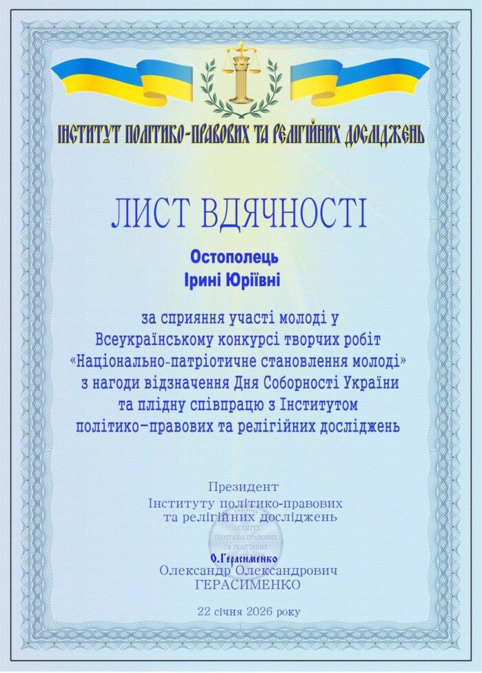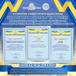 🏛🥳 Колектив Мелітопольського державного педагогічного університету імені Богдана Хмельницького щиро вітає Умерову Наталю, здобувачку вищої освіти 2 курсу першого (бакалаврського) рівня вищої освіти спеціальності С4 Психологія, зі здобуттям диплома ІІІ ступеня у Всеукраїнському конкурсі творчих робіт, ініційованому та проведеному Інститутом політико-правових та релігійних досліджень за підтримки Міністерства молоді та спорту України, Міністерства освіти і науки України, Національного агентства із забезпечення якості вищої освіти, НАПН України, Європейської культурної асамблеї, Інституту модернізації змісту освіти МОН України, Інституту проблем виховання НАПН України, КМДА, громадських організацій та інших поважних інституцій.