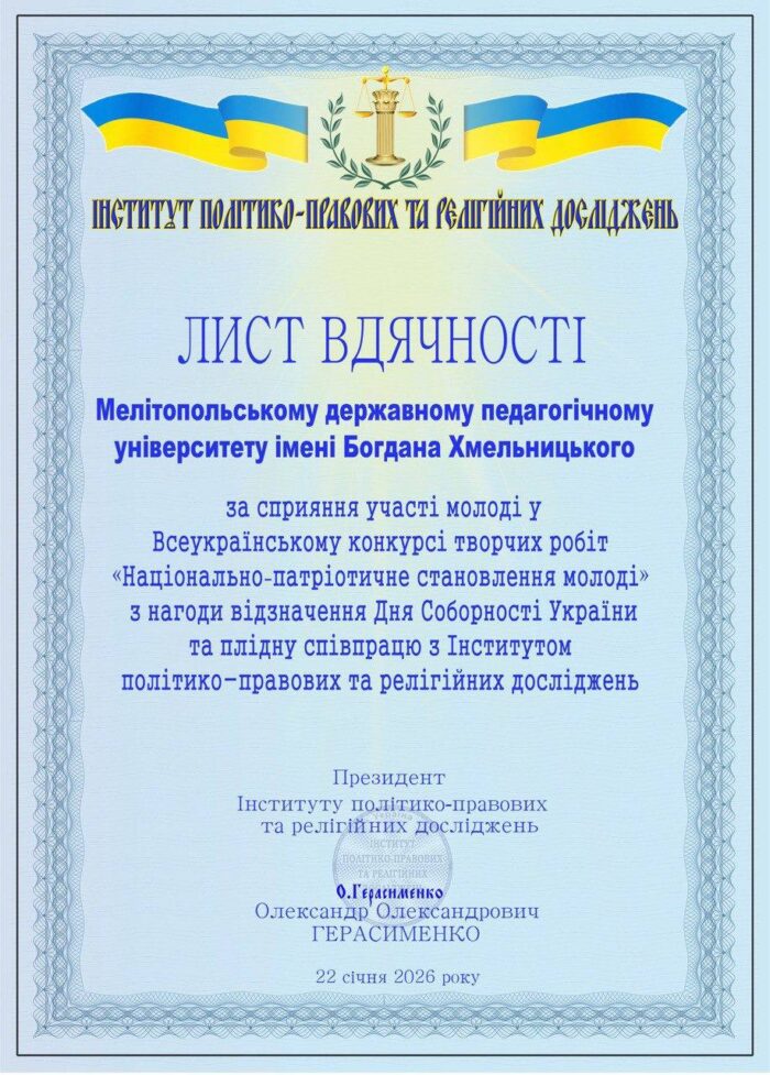 📜🏆 Важливою відзнакою стало й те, що Мелітопольський державний педагогічний університет імені Богдана Хмельницького отримав лист-подяку за активне сприяння участі молоді у Всеукраїнському конкурсі та плідну співпрацю у справі формування національної та громадянської ідентичності.