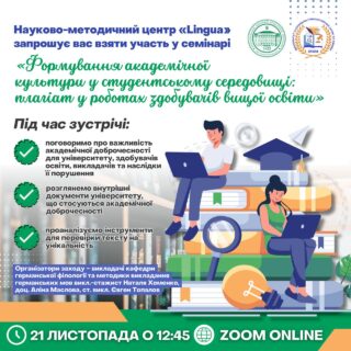 🇺🇦🏛️ Наукового-методичний центр «Lingua» запрошує вас взяти участь у семінарі «Формування академічної культури у студентському середовищі: плагіат у роботах здобувачів вищої освіти».