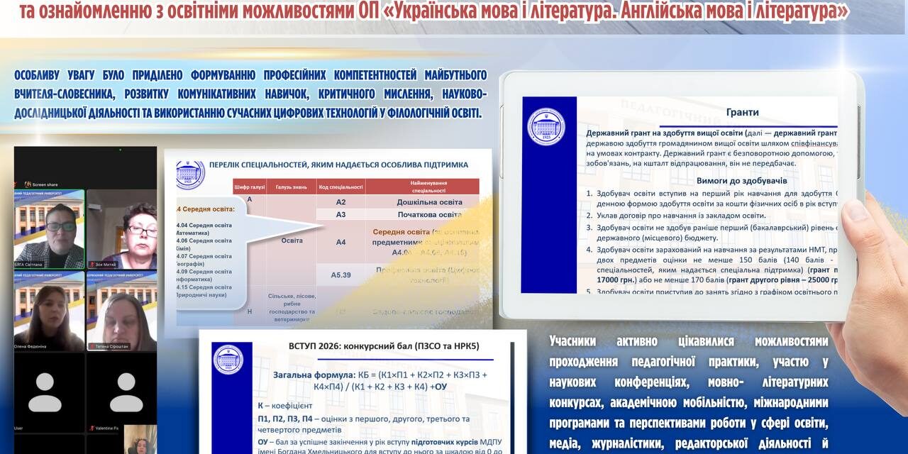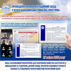 🏛 27 квітня 2026 року на факультеті суспільно-гуманітарних наук та права кафедрою української філології та зарубіжної літератури у форматі онлайн проведено профорієнтаційний захід у КЗЗСО Балабинська гімназія «Престиж» Кушугумської селищної ради Запорізької області, присвячений вибору майбутньої професії та ознайомленню з освітніми програмами й можливостями навчання в Мелітопольському державному педагогічному університеті імені Богдана Хмельницього.