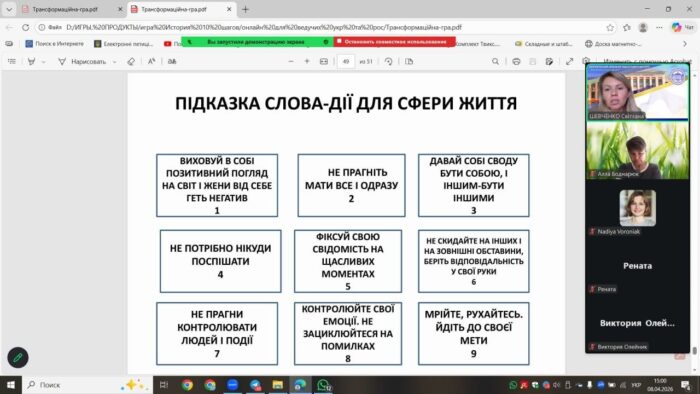 👩🏼🎓Ведуча – кандидат психологічних наук, доцент кафедри психології Шевченко Світлана Віталіївна представила особливості такого психологічного інструменту як трансформаційна гра.
