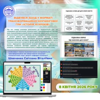 🧠 8 квітня 2026 року в рамках діяльності Центру психологічної резильєнтності та благополуччя спільно з Лабораторією психології здоров’я для всіх учасників освітнього процесу було проведено захід у форматі трансформаційної коучингової гри «Історія 10 кроків».