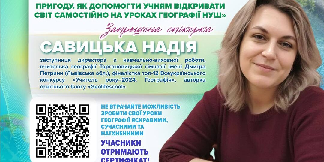🌍✈️Кафедра географії та туризму запрошує стати учасником вебінару на тему: «Географія в стилі Edutainment: як перетворити навчання на захопливу пригоду. Як допомогти учням відкривати світ самостійно на уроках географії НУШ»