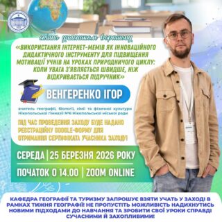 🌍✈️Кафедра географії та туризму запрошує стати учасником воркшопу на тему: «Використання інтернет-мемів як інноваційного дидактичного інструменту для підвищення мотивації учнів на уроках природничого циклу: коли увага з’являється швидше, ніж відкривається підручник»