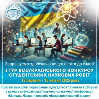 📅 З 18 березня по 15 квітня 2025 триває I тур Всеукраїнського конкурсу студентських наукових робіт! Це ваш шанс проявити себе, показати свої дослідження та зробити вагомий внесок у науку!
