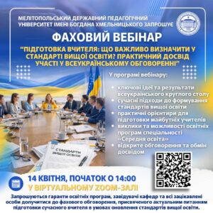 🏛️ Мелітопольський державний педагогічний університет імені Богдана Хмельницького запрошує гарантів освітніх програм, завідувачів кафедр та всіх зацікавлених осіб долучитися до фахового вебінару, присвяченого актуальним питанням підготовки сучасного вчителя в умовах оновлення стандартів вищої освіти.