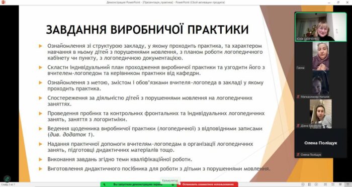 🧩 Учасники конференції детально розглянули основні завдання виробничої практики, зокрема: ознайомлення зі структурою закладу освіти, особливостями організації логопедичної роботи, спостереження та проведення індивідуальних і фронтальних логопедичних занять, участь у заняттях з логоритміки, виготовлення дидактичних матеріалів, а також виконання завдань відповідно до теми кваліфікаційної роботи.