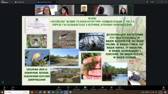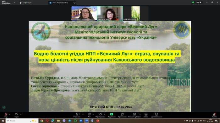 🔹🌿 Наталія Сурядна, кандидат біологічних наук, доцент, завідувачка кафедри екології та інформаційних технологій МІЕСТ Університету «Україна», науковий співробітник НПП «Великий Луг», разом із Євгеном Горбенком, старшим науковим співробітником НПП «Великий Луг», та Лідією Герман-Дроздовою, науковою співробітницею НПП «Великий Луг», висвітлили питання трансформації водно-болотних угідь НПП «Великий Луг», втрати природних комплексів унаслідок створення Каховського водосховища, перебування частини територій в окупації та появи нових можливостей природного відновлення після руйнування греблі.