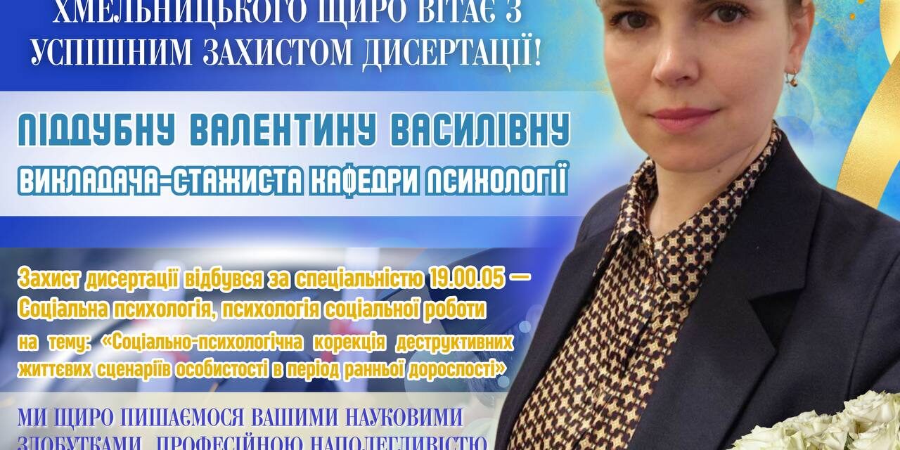 🏛️🥳 Колектив МДПУ імені Богдана Хмельницького щиро вітає Піддубну Валентину Василівну, викладача-стажиста кафедри психології, з визначною науковою подією — успішним захистом дисертації на тему «Соціально-психологічна корекція деструктивних життєвих сценаріїв особистості в період ранньої дорослості» за спеціальністю 19.00.05 — Соціальна психологія, психологія соціальної роботи.