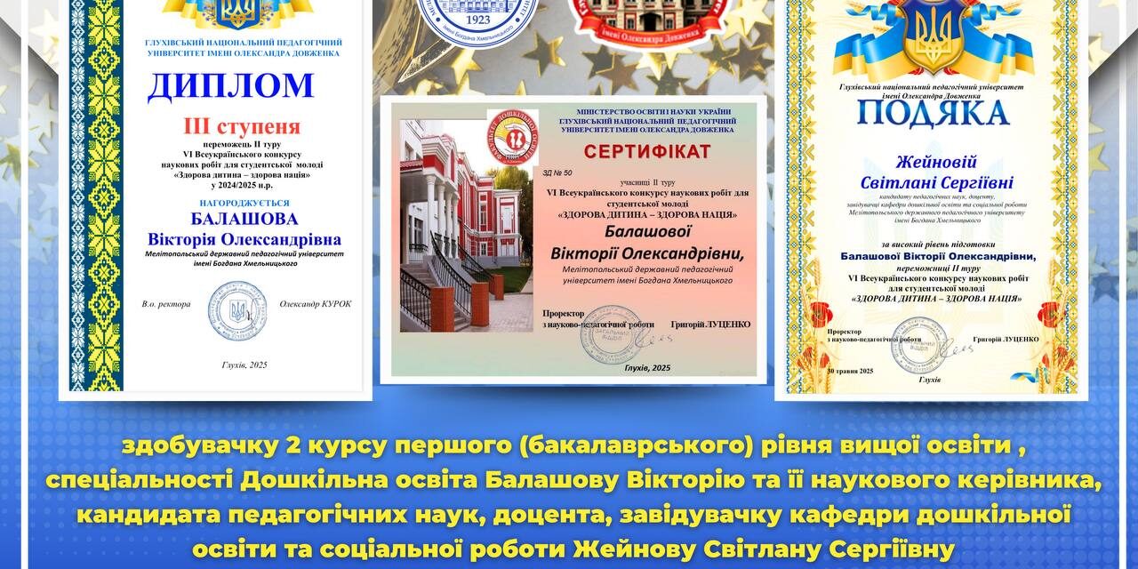 👩🏻🎓👏🏻 Колектив Мелітопольського державного педагогічного університету імені Богдана Хмельницького щиро вітає Балашову Вікторію – здобувачку 2 курсу першого (бакалаврського) рівня вищої освіти спеціальності “Дошкільна освіта” факультету соціально-педагогічної та мистецької освіти – з вагомим науковим досягненням!