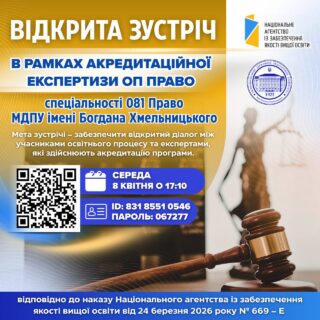 Протягом 8 -10 квітня 2026 року відповідно до наказу Національного агентства із забезпечення якості вищої освіти від 24 березня 2026 року № 669 – Е відбудеться акредитаційна експертиза освітньої програми Мелітопольського державного педагогічного університету імені Богдана Хмельницького 081 ПРАВО.