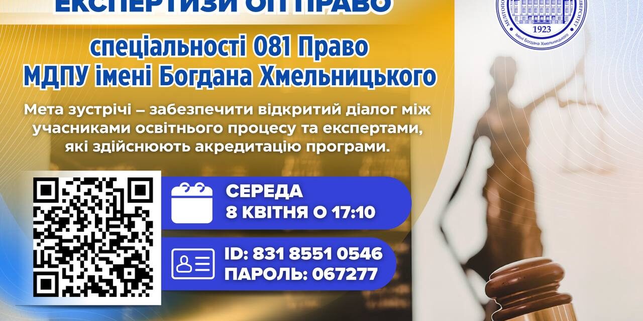 Протягом 8 -10 квітня 2026 року відповідно до наказу Національного агентства із забезпечення якості вищої освіти від 24 березня 2026 року № 669 – Е відбудеться акредитаційна експертиза освітньої програми Мелітопольського державного педагогічного університету імені Богдана Хмельницького 081 ПРАВО.