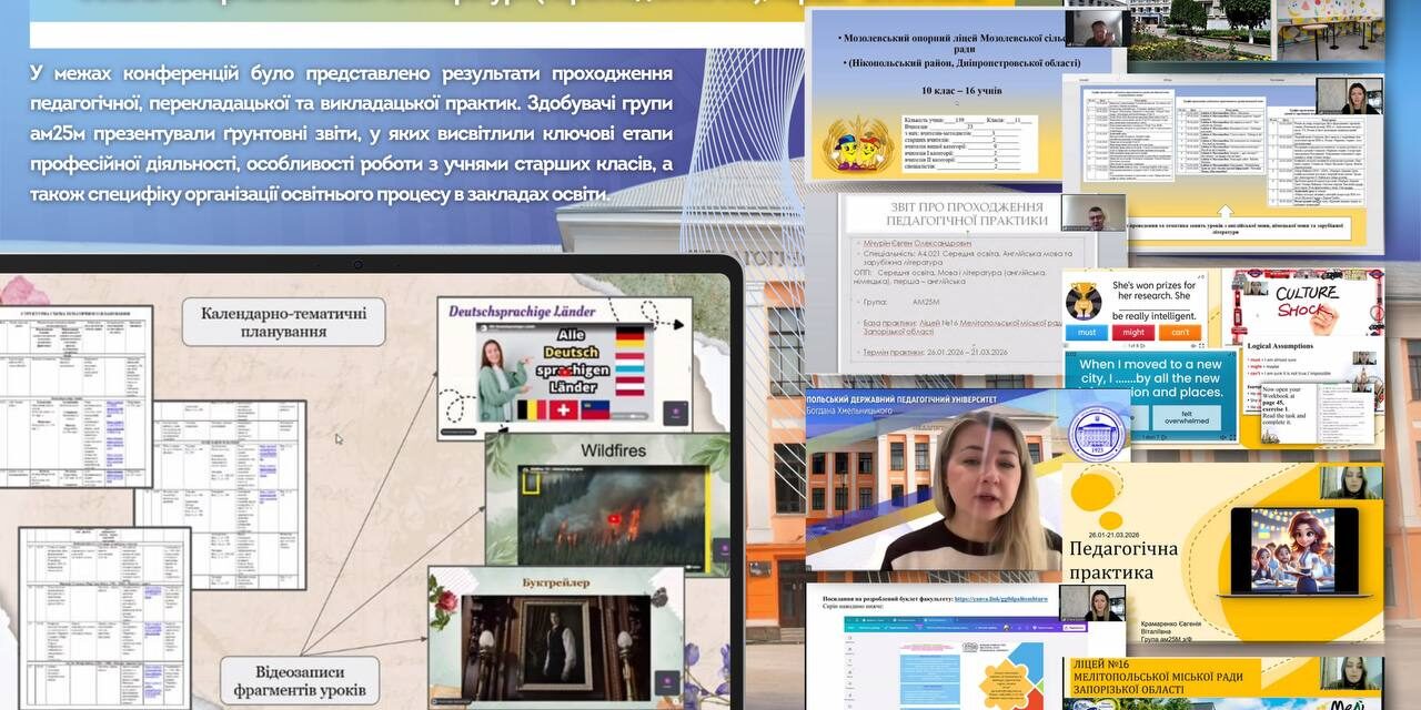 📖📌У межах конференцій було представлено результати проходження педагогічної, перекладацької та викладацької практик. Здобувачі групи ам25м презентували ґрунтовні звіти, у яких висвітлили ключові етапи професійної діяльності, особливості роботи з учнями старших класів, а також специфіку організації освітнього процесу в закладах освіти.