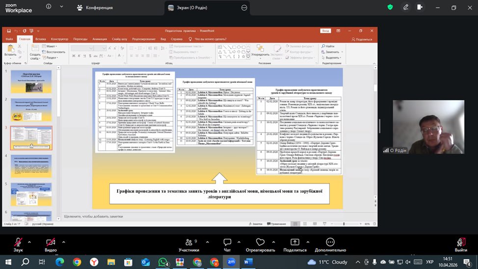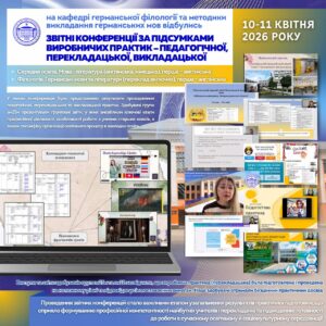 📅 10–11 квітня 2026 року на кафедрі германської філології та методики викладання германських мов було проведено звітні конференції за підсумками виробничих практик – педагогічної, перекладацької, викладацької для здобувачів 1 курсу другого (магістерського) рівня вищої освіти та для здобувачів 4 курсу першого (бакалаврського) рівня вищої освіти заочної форми навчання наступних ОП: